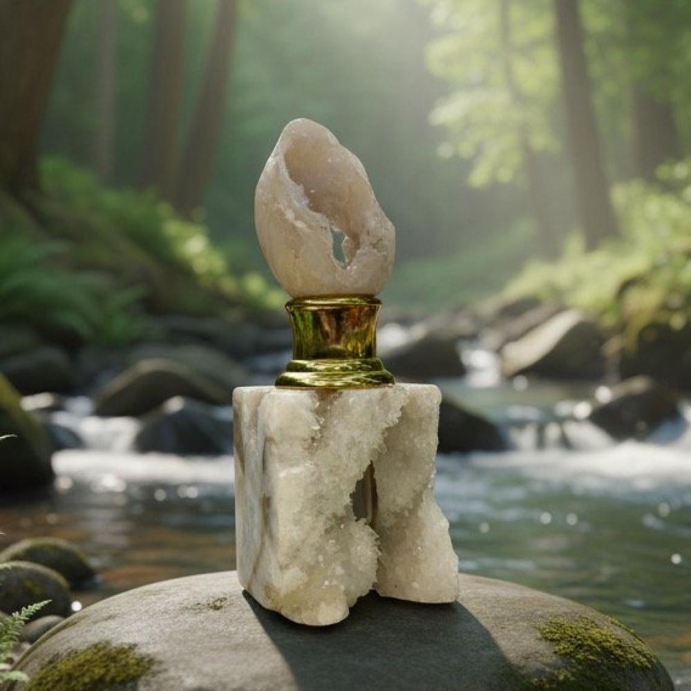 "ربع توله أنيق مصنوع من حجر الكريستال الطبيعي، بلونه الأبيض النقي مع تفاصيل شفافة تضفي لمسة راقية. تصميم فاخر بقاعدة ذهبية فخمة، يجمع بين الفخامة والطبيعة في تحفة فريدة."